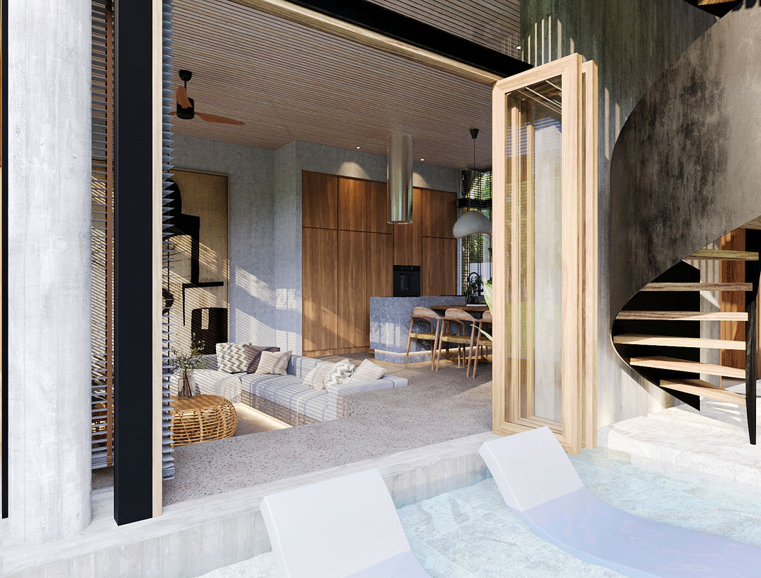 Each of the two studio units spans two floors. The upper level includes a bedroom, balcony, and a skylight bathroom that fills the space with natural light. The ground floor features a sunken living room, open kitchen and dining area, and direct access to a private plunge pool.